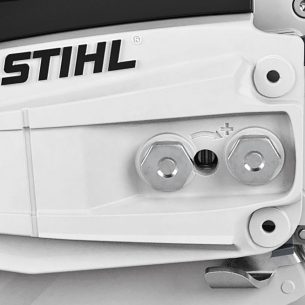 Die Spannschraube wird seitlich durch den Kettenraddeckel hindurch betätigt. Das verhindert den Kontakt der Hand mit der scharfen Sägekette und den Spitzen des Krallenanschlages.